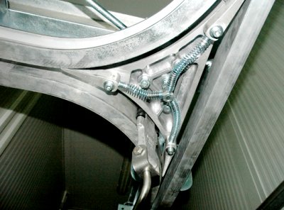 The spring mounted on a three way joint is controlled with centrifugal force by a control arm and a polyamide rod extending down and connected to it.